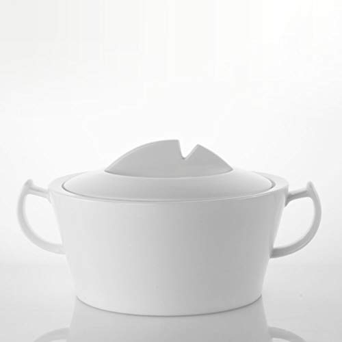 Sopera con tapa de 2,5 litros de porcelana blanca dura para servir sopas en la mesa. La estable porcelana de hotel garantiza una alta resistencia a altas temperaturas en una terrina de porcelana precalentada. Las elegantes asas curvadas permiten un f cil transporte de la sopera